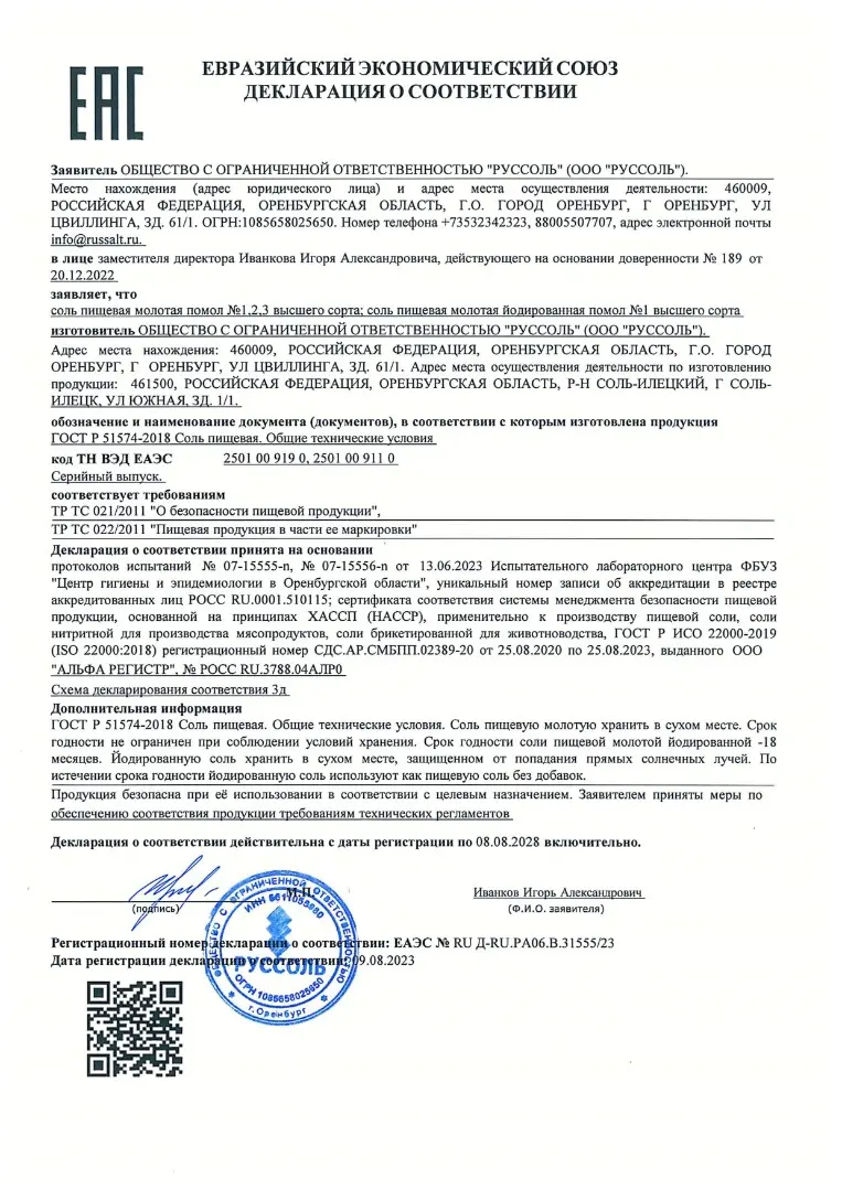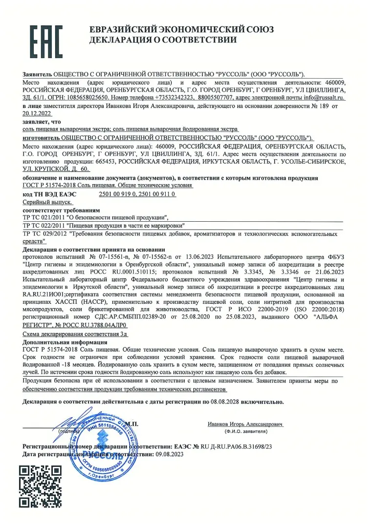 Вся продукция сертифицирована по ГОСТ 51574-2018. С каждой партией предоставляем: Сертификат соответствия, Декларацию о соответствии ТР ТС, Протоколы испытаний, Паспорт качества.